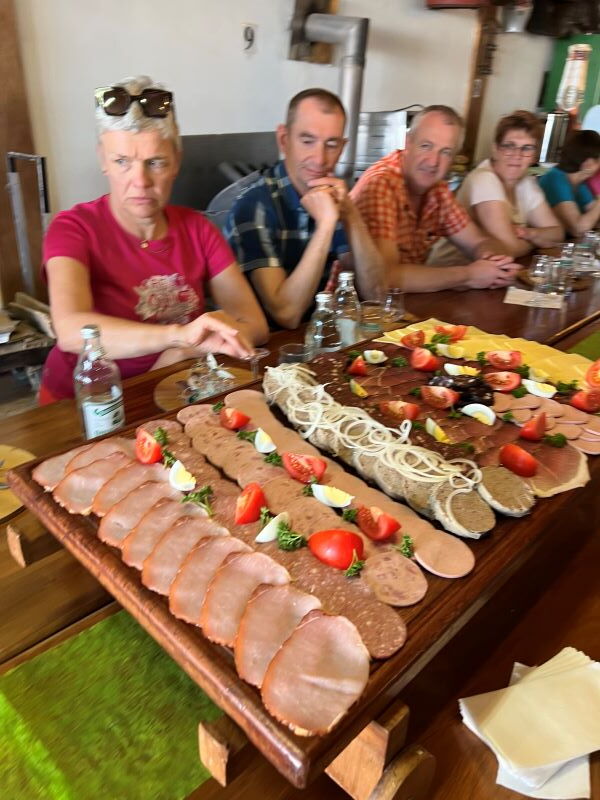 Um 18 Uhr folgte das gemeinsame Vesper an einer langen Tafel mit dem „rollenden Vesper“ und selbstgebackenem Bauernbrot. Das Vesper fuhr auf einem Wagen auf der langen Tafel hin und her, so konnte sich jeder selbst bedienen.