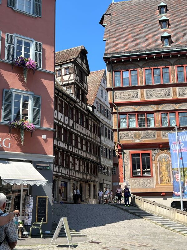 Auf dem Parkplatz Hirtenhaus bei Horb legten wir eine Frühstückspause ein, wo wir uns bei einem Sektfrühstück mit Kaffee und Butterbrezeln stärkten. Anschließend fuhren wir weiter nach Tübingen, wo wir eine Stadtführung bekamen. Tübingen ist eine charmante Universitätsstadt am Ufer des Neckars gelegen. Wir liefen durch die berühmte Platanenallee, die wunderschöne Altstadt mit den verwinkelten Gassen, um die vielen Fachwerkhäuser, den Hölderlinturm, das Schloss Hohentübingen, das Rathaus und die vielen schönen Cafés, Gaststätten und Einkaufsläden zu bestaunen. Nachmittags trafen wir uns zum Stocherkahn fahren. Dies war für alle ein sehr schönes und erfrischendes Erlebnis bei über 30 Grad Temperatur.